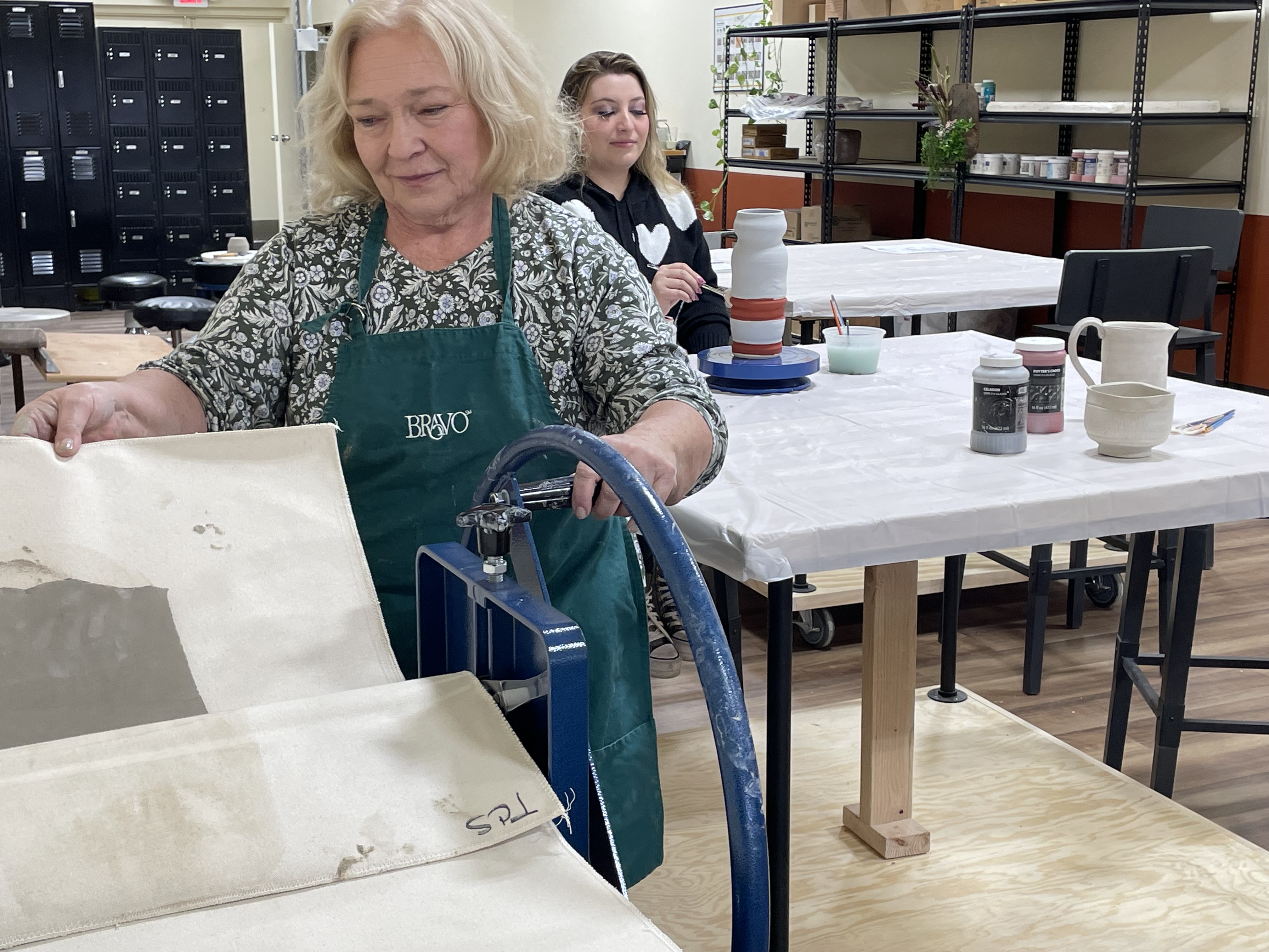Time to work on tables to complete glazing of a bisqued piece of art.